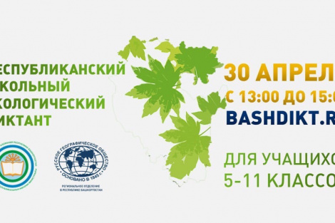 Для участия в диктанте необходимо 30 апреля с 13.00 до 15.00 сайти на сайт https://bashdict.ru/ и ответить на 30 вопросов экологической тематики. Все участники получат сертификат об участии, а ,набравшие 100 баллов будут награждены грамотами от РГО РБ.